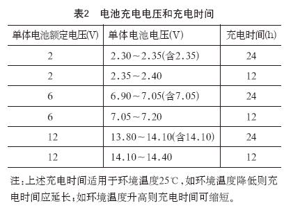 ??①密封蓄電池在使用前不需進行初充電,但應進行補充充電。補充充電方式及充電電壓應按產品技術說明書規定進行。一般情況下應采取恒壓限流充電方式,補充充電電流不得大于0.2C10(C10為電池的額定容量),充電電壓和充電時間如表2所示。